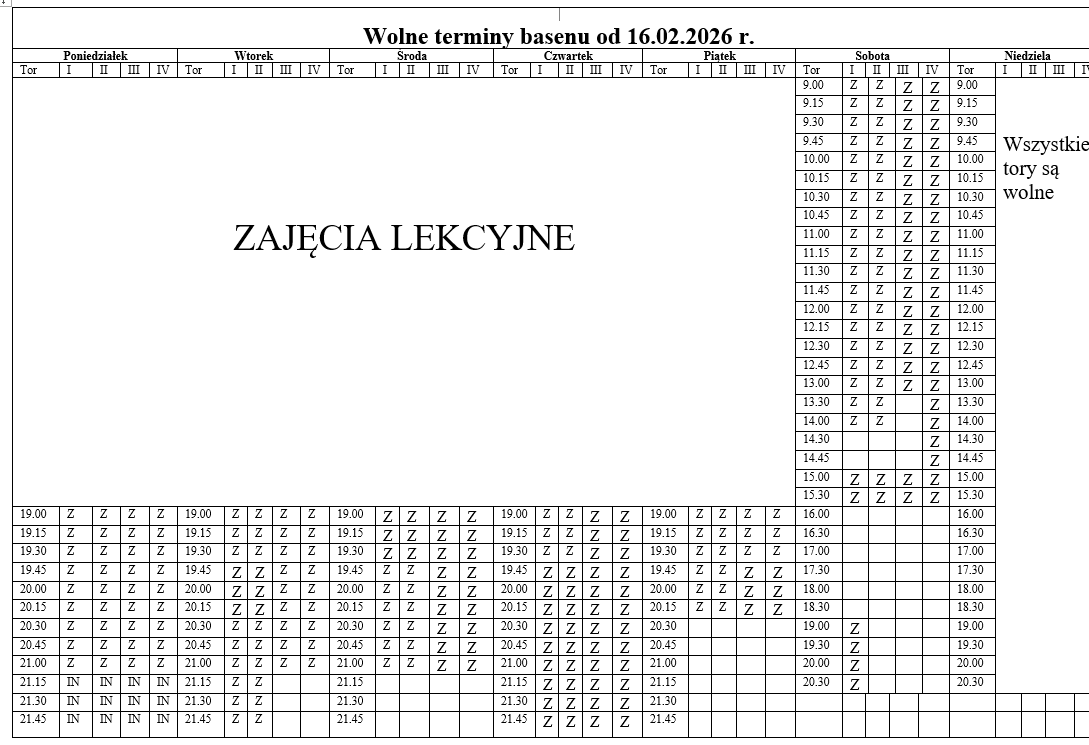 Informujemy, że basen dostępny jest od poniedziałku do piątku w godz. 19:00 - 22:00 oraz w soboty w godz. 09:00 - 21:00, z zastrzeżeniem torów wynajętych (zgodnie z załączonym poniżej grafikiem)