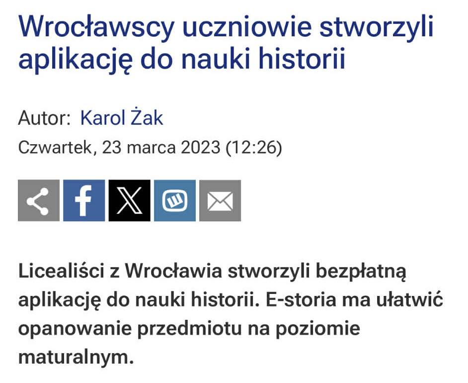 Wszystko zaczęło się w czerwcu 2022 roku, kiedy 7 przyjaciół z klasy F (rocznik 2024) stworzyła ankietę na temat nauczania historii w naszej szkole. Na ankiecie się nie zakończyło i wkrótce powstała jedna z większych aplikacji do nauki historii w Polsce o nazwie E-storia. Szybko zyskała popularność i skutecznie pomagała uczniów w opanowaniu całego zakresu materiału z historii. Wykorzystując intuicyjny interfejs i system krótkich powtórek szybko zyskała sympatyków.