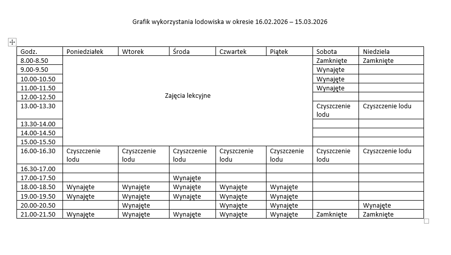 Informujemy, że od dnia 31.01.2026 r. lodowisko jest czynne w każdy dzień tygodnia.