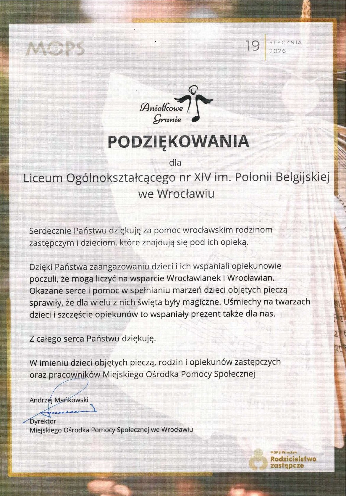 Podziękowania dla LO nr XIV od MOPS we Wrocławiu