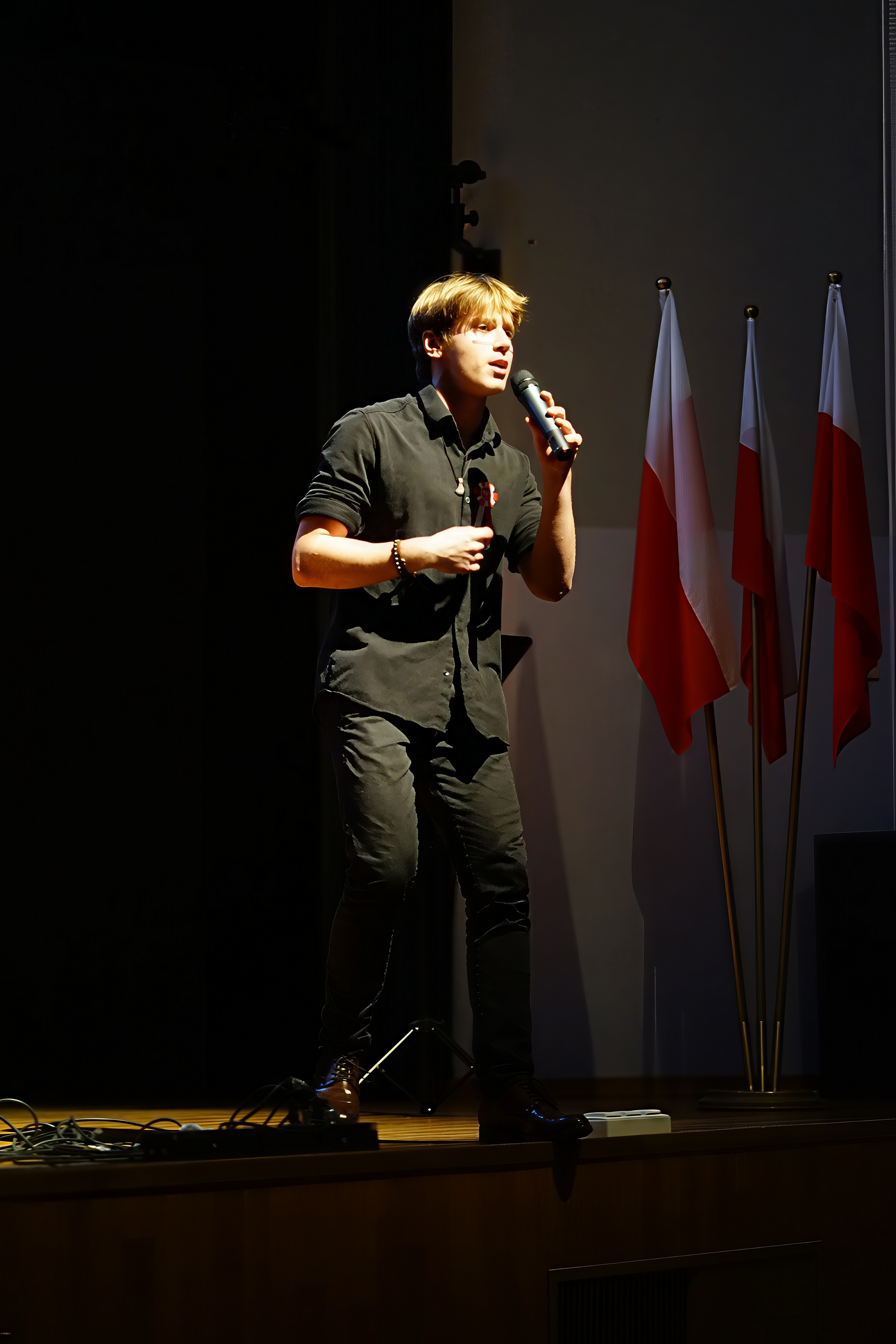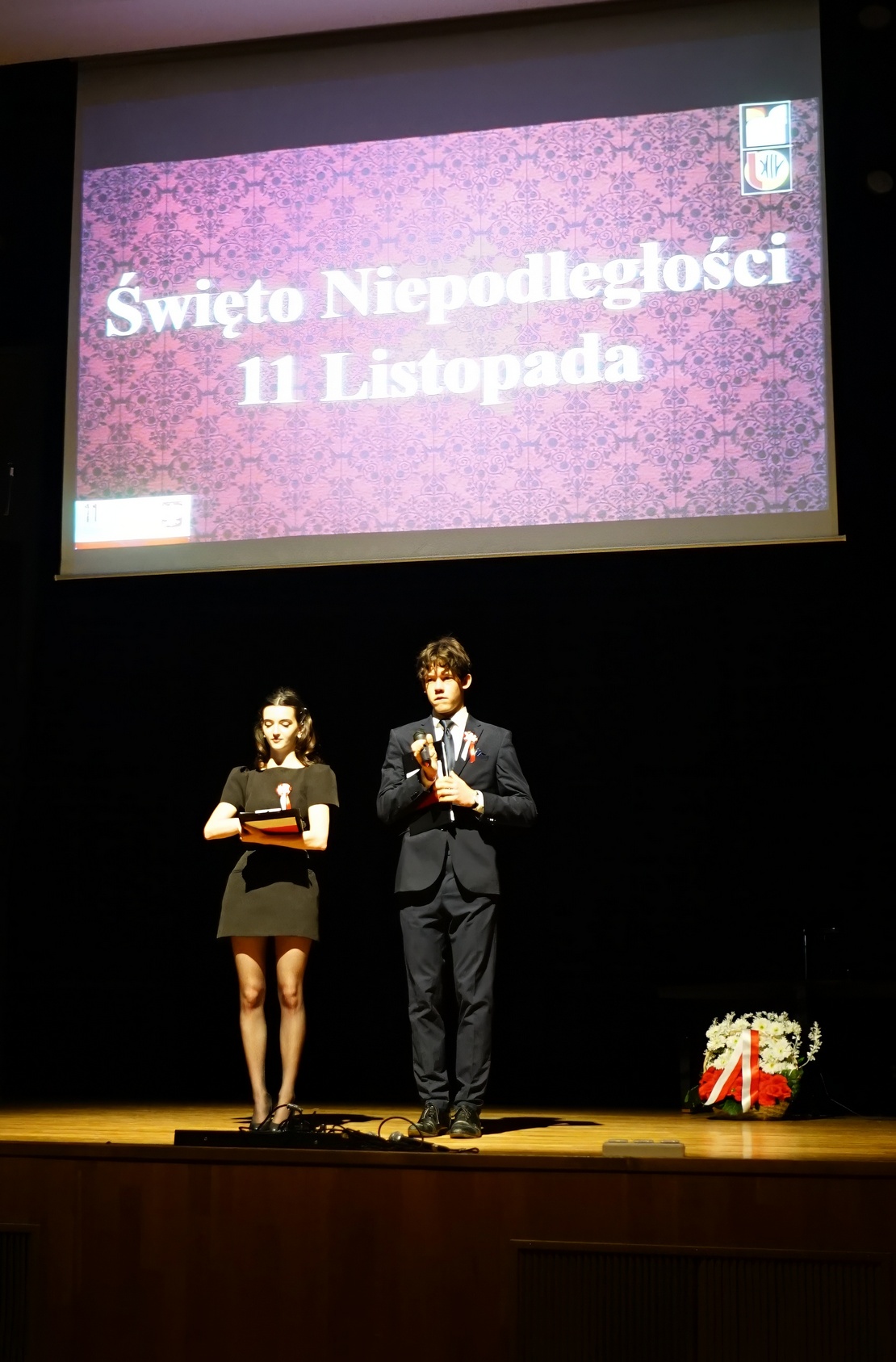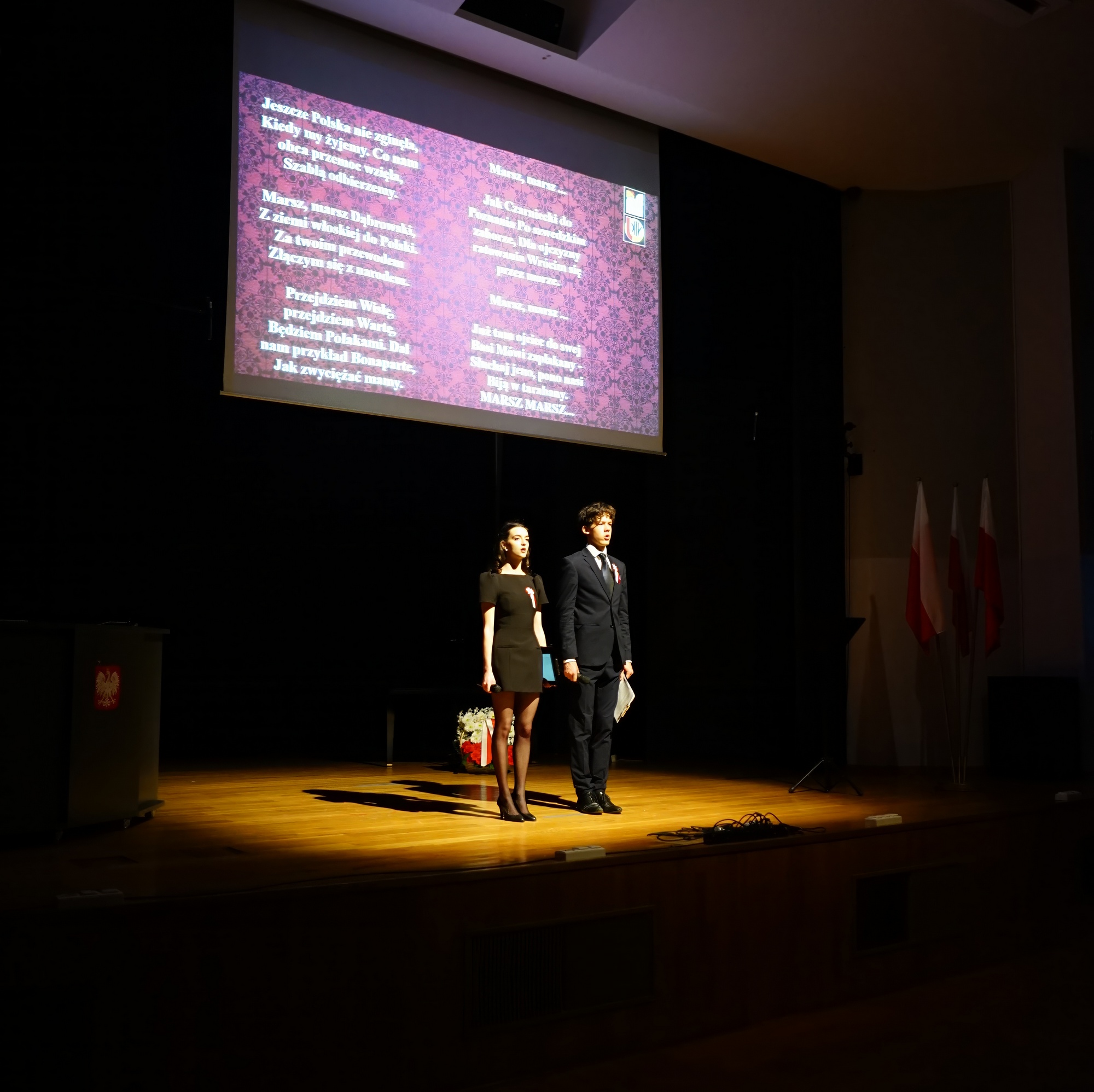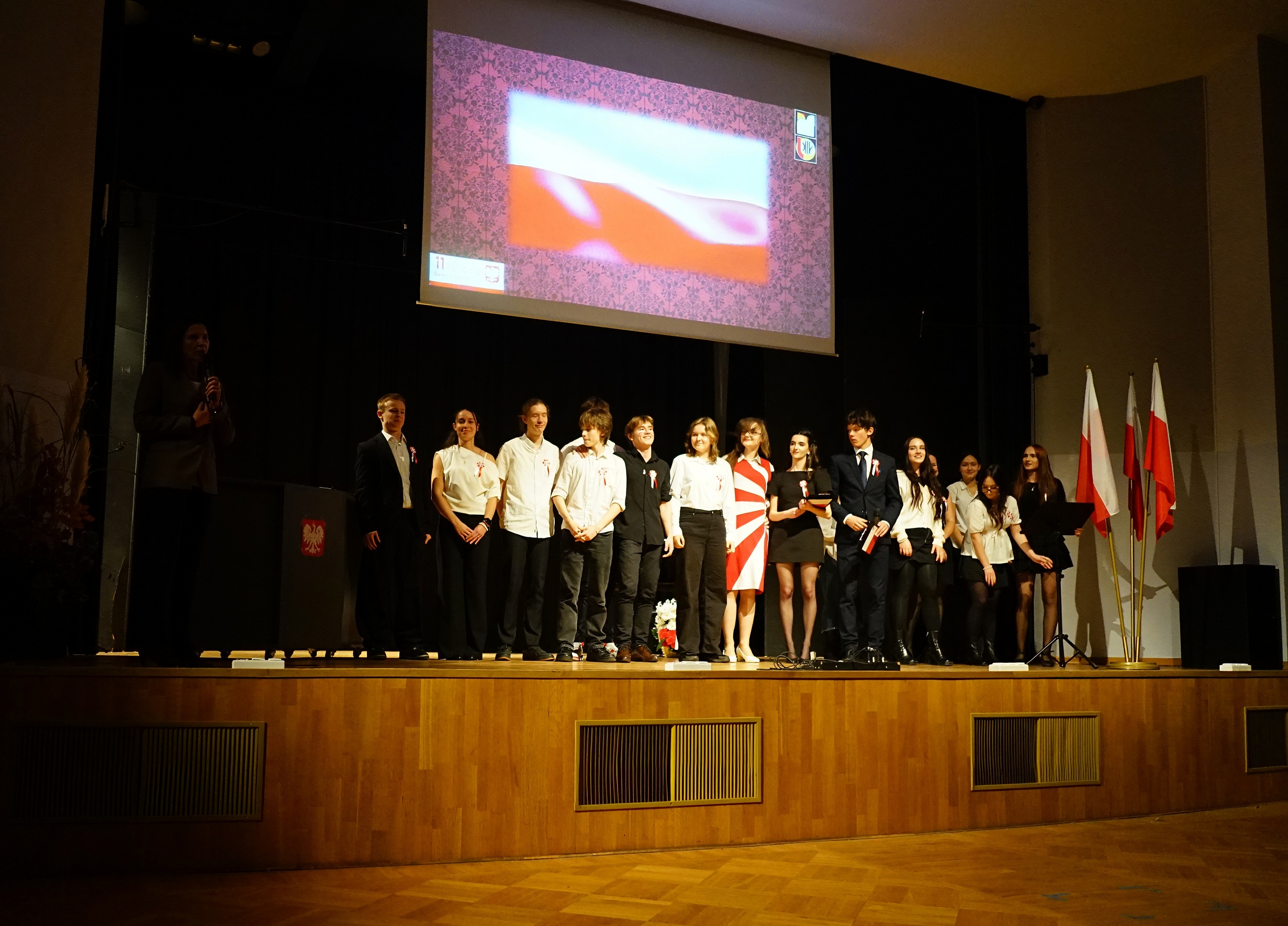 w wykonaniu Vincenta Kubota z klasy 1F. Na scenie - odczytując depeszę Józefa Piłsudskiego notyfikującą powstania niepodległego państwa polskiego - wystąpili również Nathaniel Atamańczyk-Carrillo oraz Mateusz Kołodziejczak z klasy 1F.