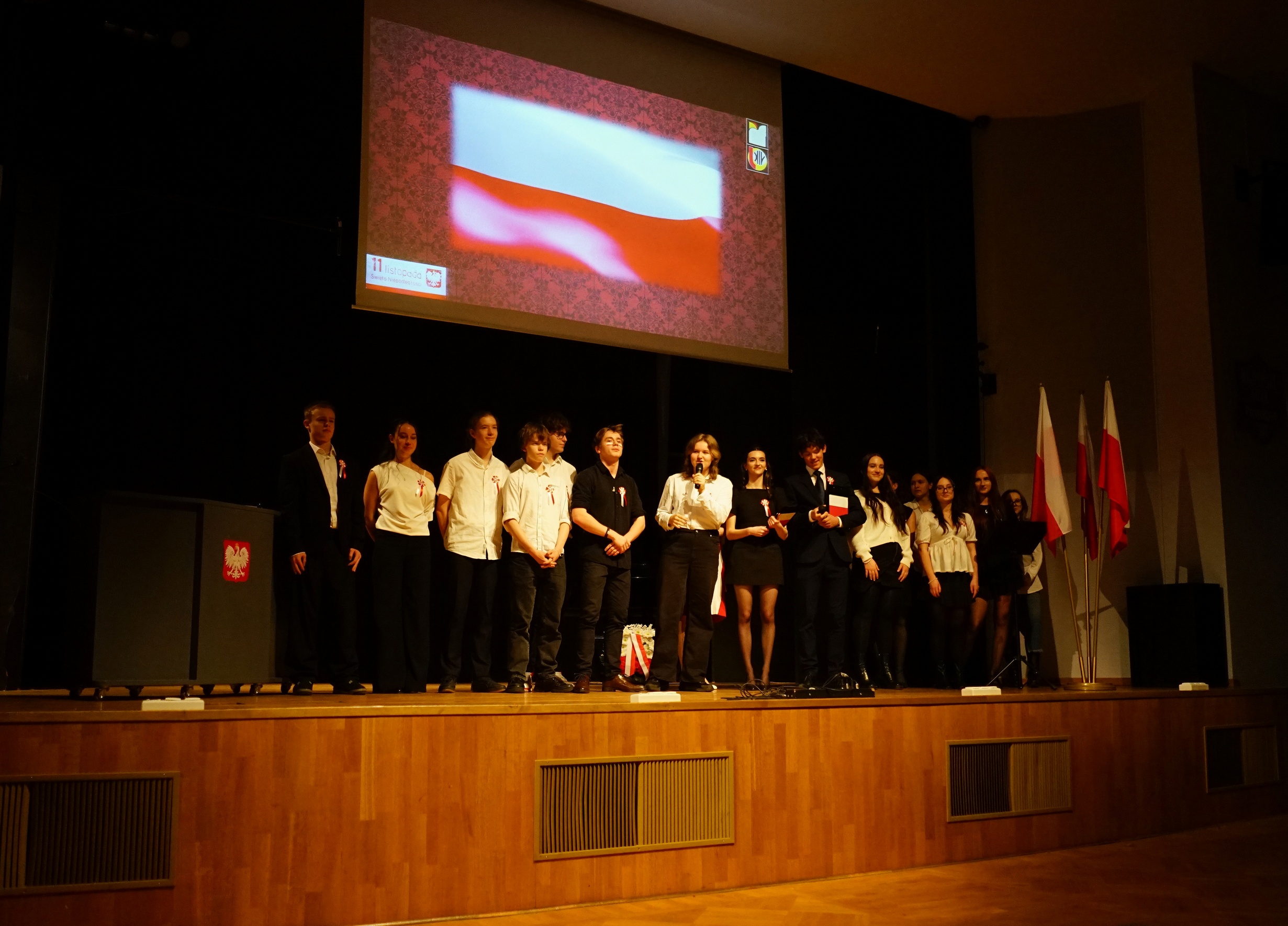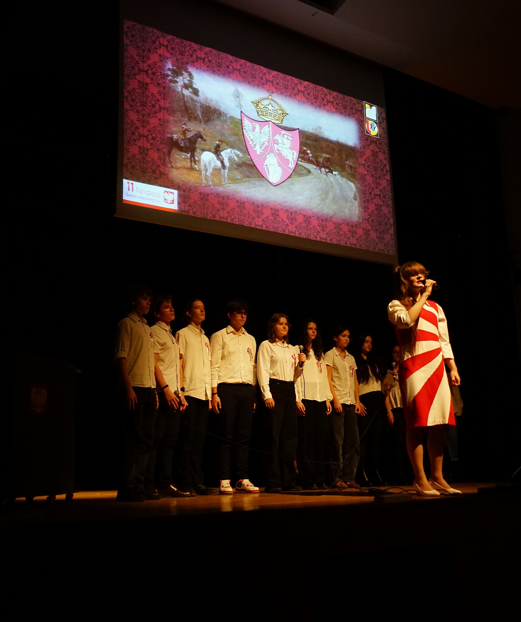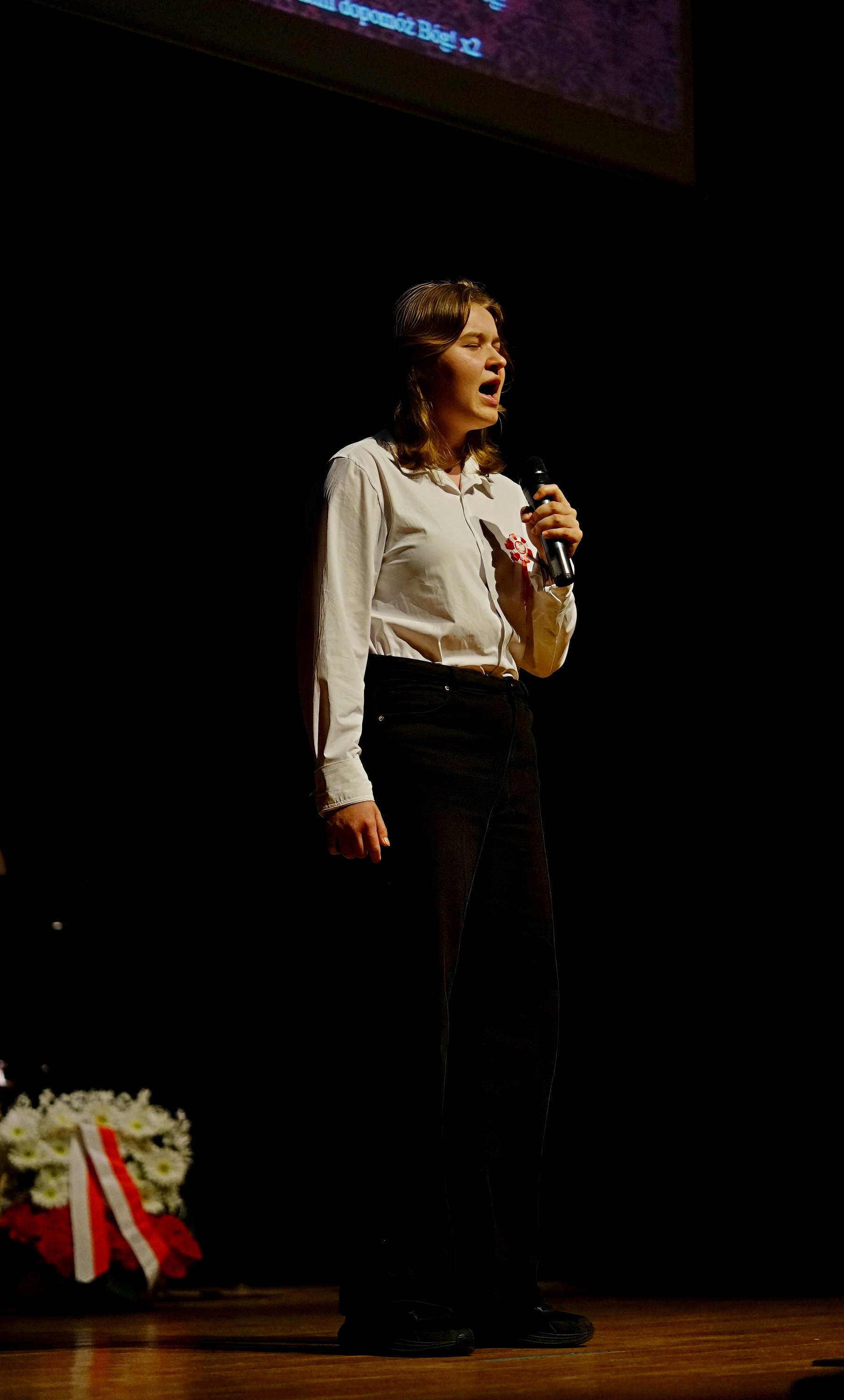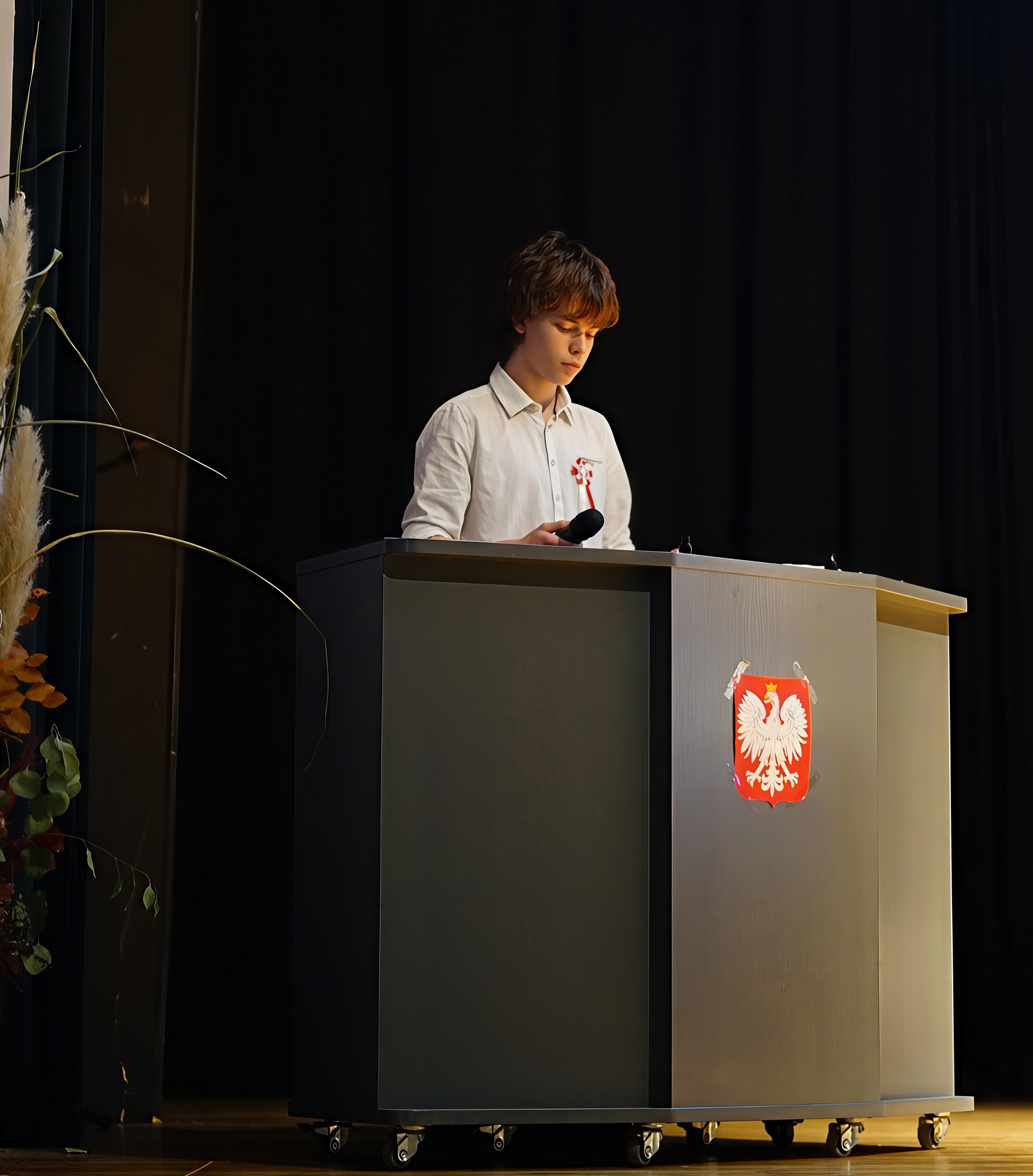 w wykonaniu Vincenta Kubota z klasy 1F. Na scenie - odczytując depeszę Józefa Piłsudskiego notyfikującą powstania niepodległego państwa polskiego - wystąpili również Nathaniel Atamańczyk-Carrillo oraz Mateusz Kołodziejczak z klasy 1F.
