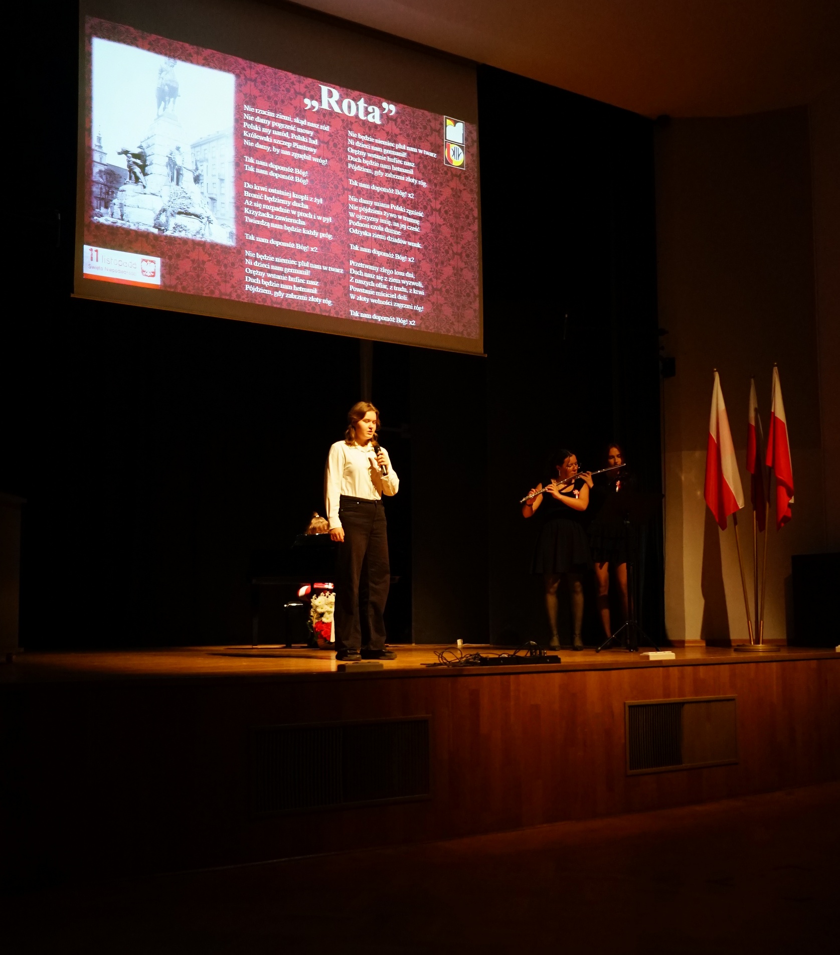 Utworowi ”Rota” towarzyszył akompaniament w wykonaniu Magdaleny Buczak (pianino) oraz Marceliny Mikuśkiewicz i Zuzanny Nowalińskiej (flety) z klasy 4C.