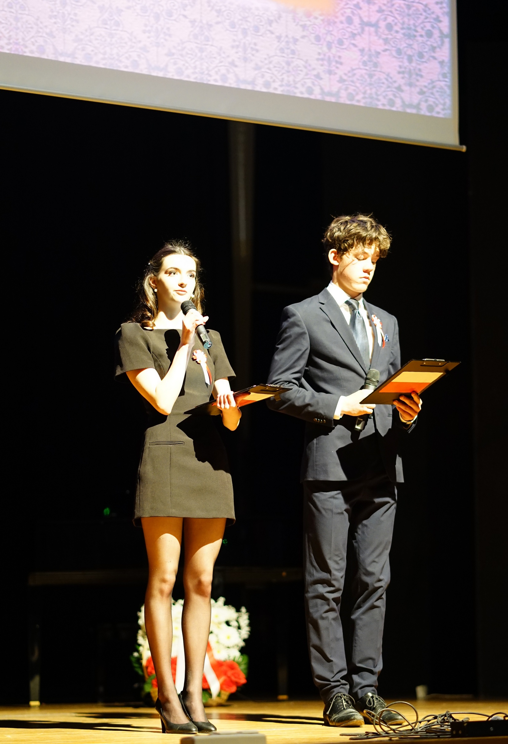 Uroczystość poprowadzili Basia Kręcisz, Karol Mazurkiewicz oraz Mikołaj Erdman z klasy 3D2.
