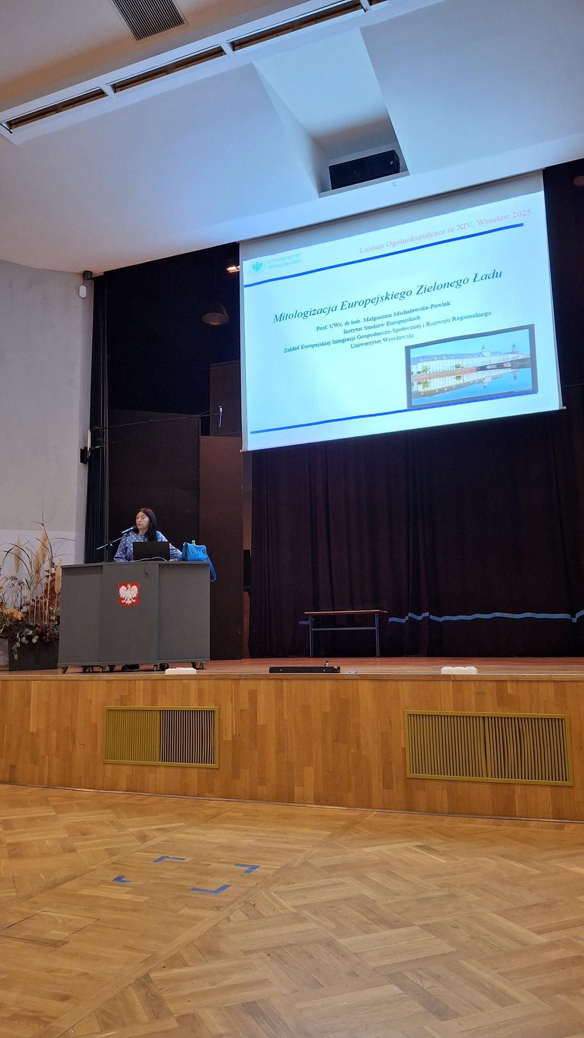 19 listopada 2025 r. w auli Czternastki Pani dr hab. Małgorzata Michalewska-Pawlak, prof. UWr wygłosiła wykład o mitologizacji Europejskiego Zielonego Ładu w dyskursie publicznym. Spotkanie otworzyła Dyrektor Szkoły, Agnieszka Bednarska.