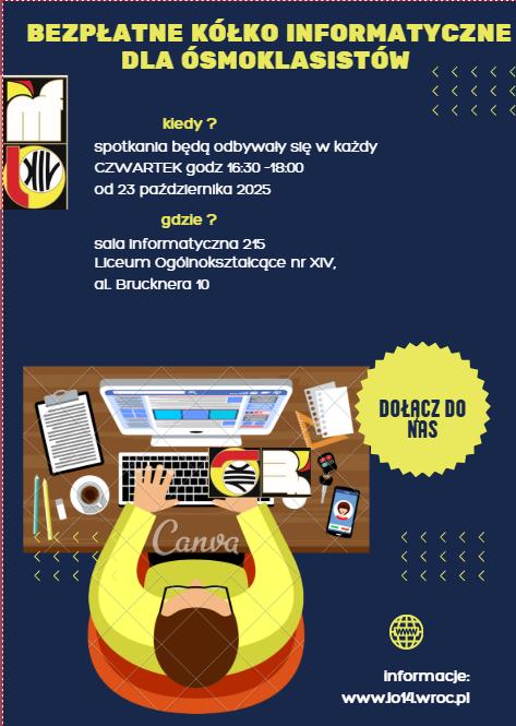 Zajęcia z informatyki rozpoczynają się 23 października (czwartek) o godz. 16:30-18:00 w budynku Liceum Ogólnokształcącego nr XIV we Wrocławiu, al. Brucknera 10, sala 215. Do zajęć można dołączyć w każdej chwili.